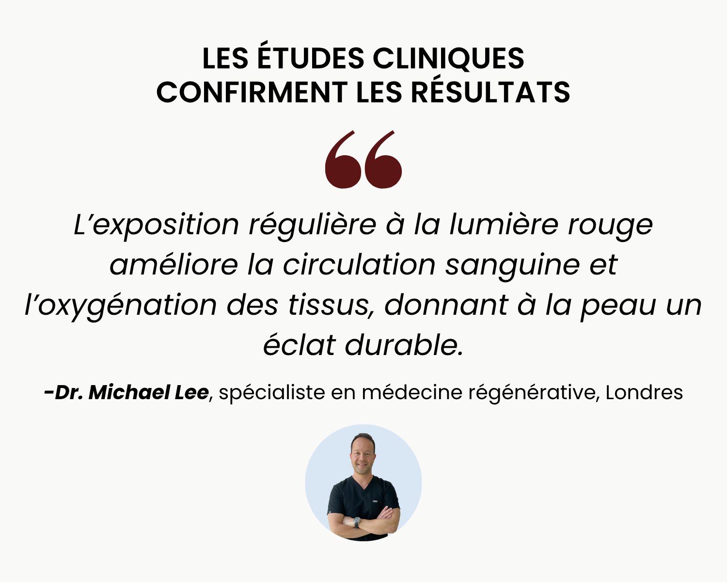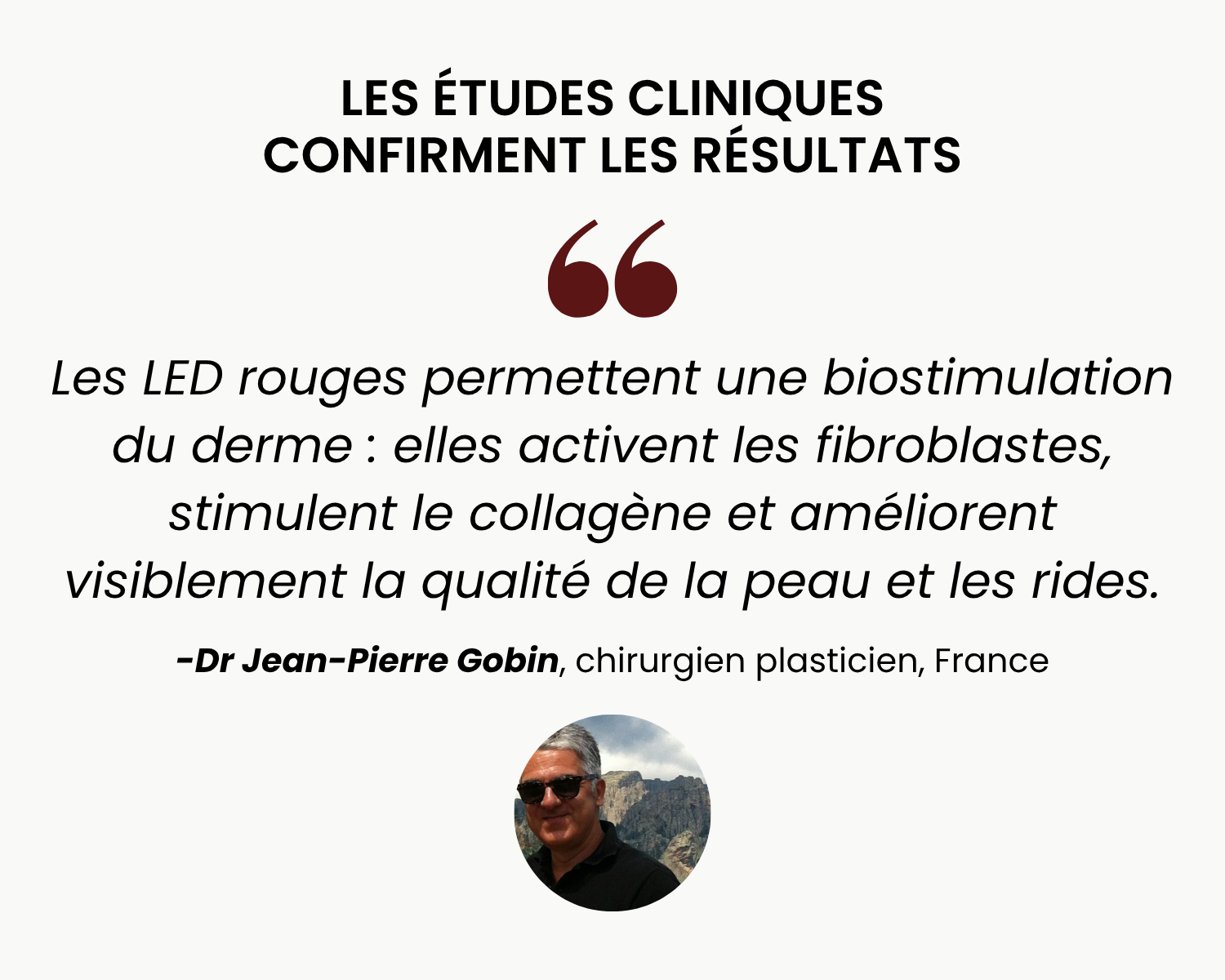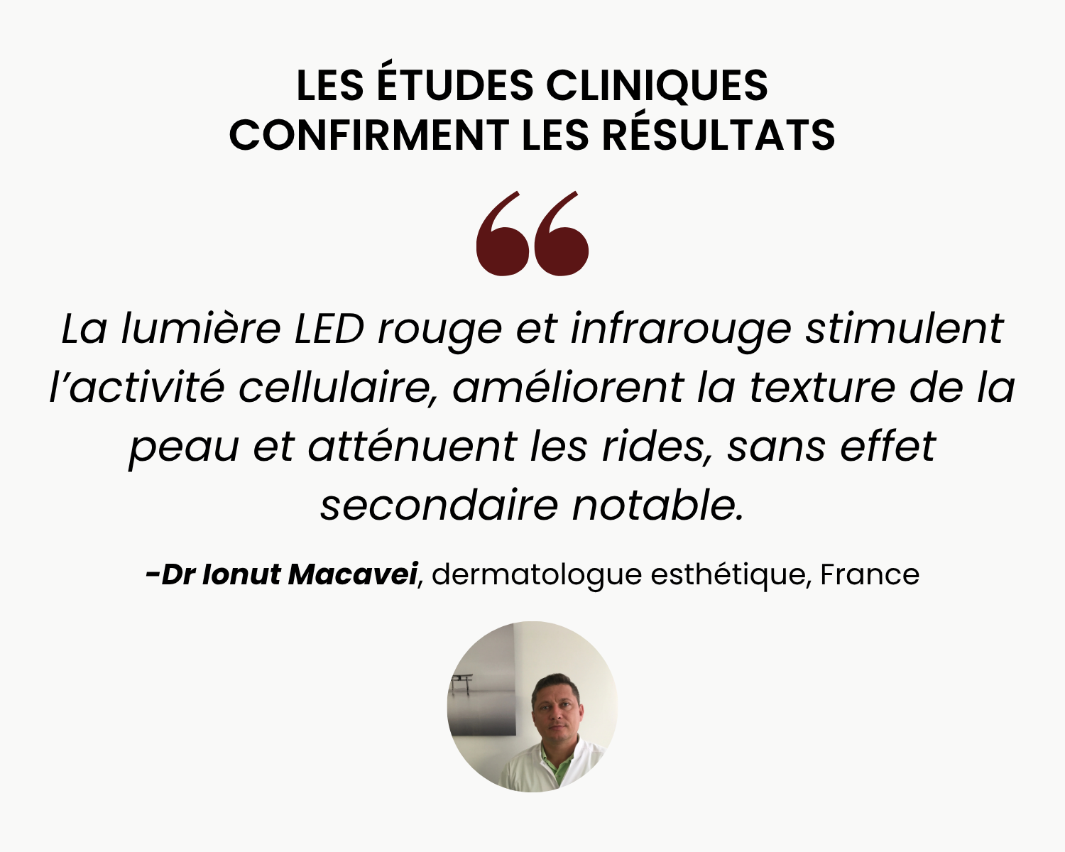La lumière rouge (633 nm) et proche infrarouge (830 nm) activent les cellules de la peau en profondeur, favorisent la régénération et stimule la production naturelle de collagène.
