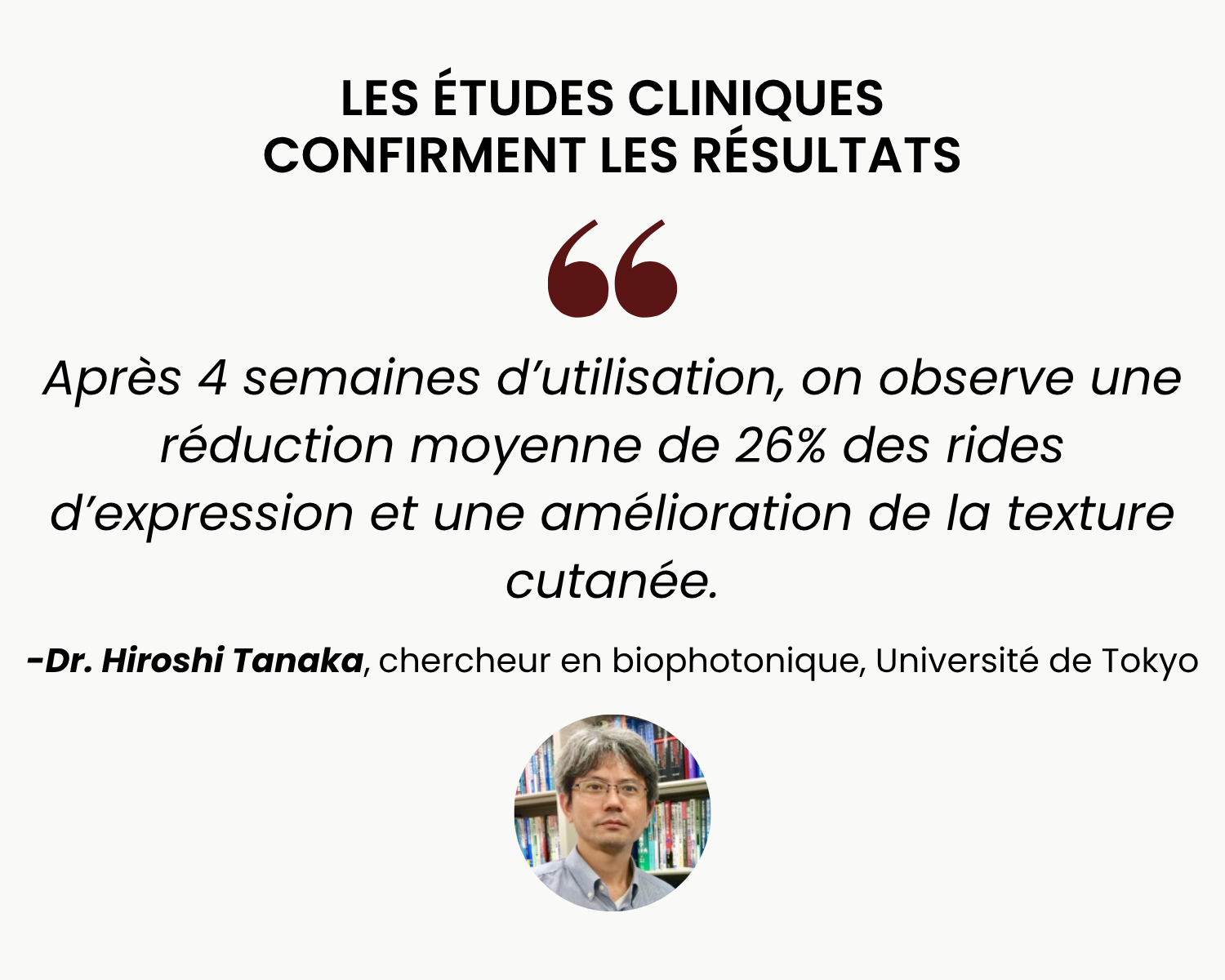 On observe une réduction de 26% des rides d’expression, la peau retrouve son éclat naturel grâce à la stimulation du collagène.
